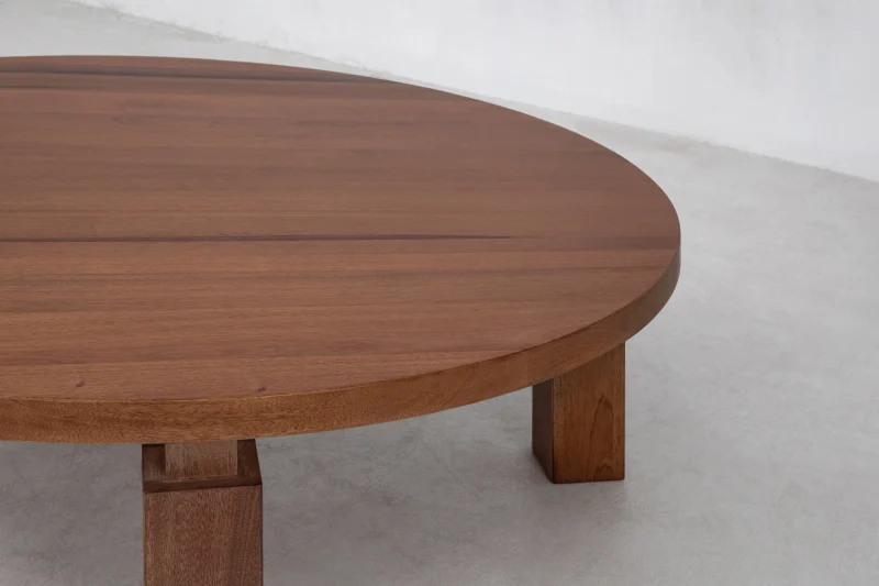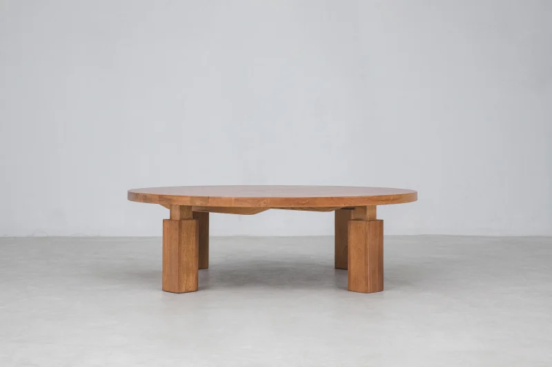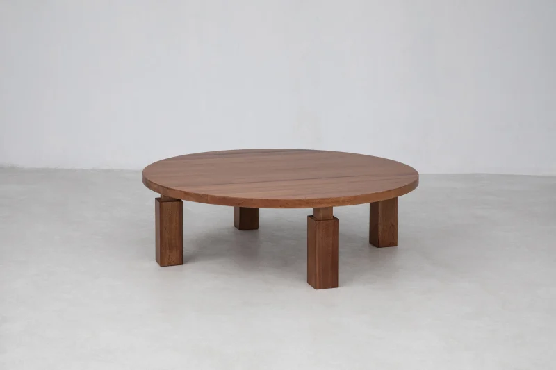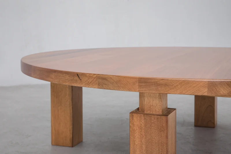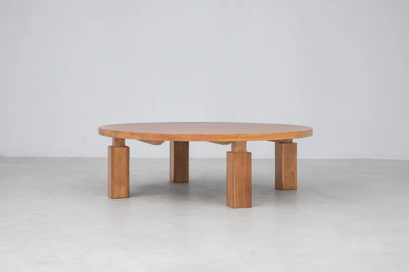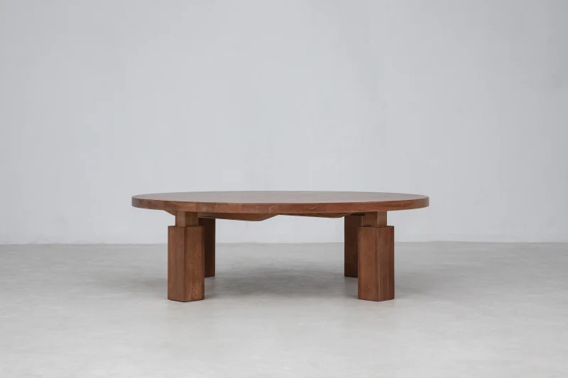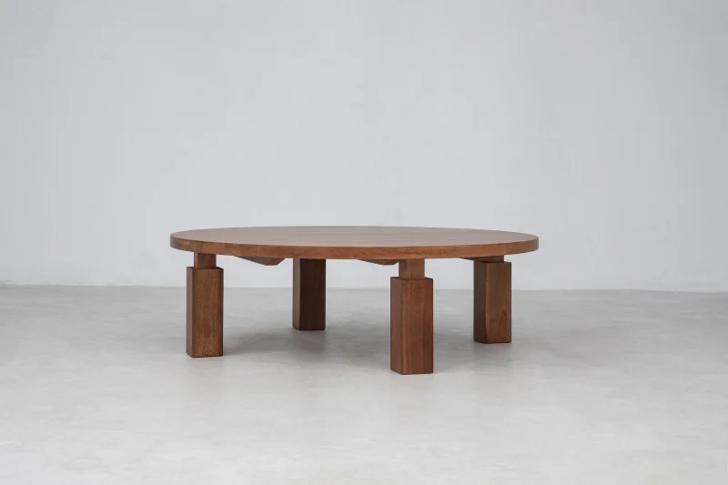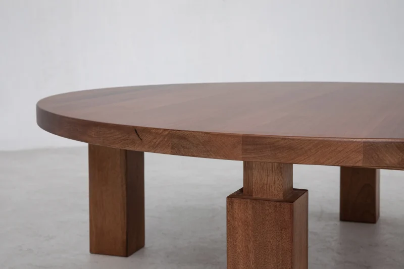 The Wolo Coffee Table by Sun at Six features the beautiful grain and luminescent sheen of makata wood. Its design focuses on contrast as a guiding concept, featuring thick columnar legs attached with thin connective tissue for a sculptural feel. The simple geometry emphasizes the quality of the solid, sustainable makata wood. Available in both a rectangular and round version.