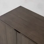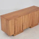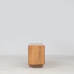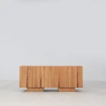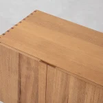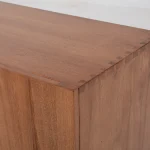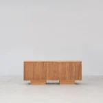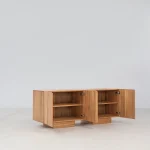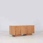 The Wolo Media Cabinet by Sun at Six emphasizes the natural characteristics of makata wood with solid front panels that highlight its contrasting grains, color, and luminescent sheen that changes with the light. There is no veneer here, just solid hardwood panels. The back is also fully finished, allowing the piece to float in the middle of a room. The whole piece is combined with joinery, which can be seen externally in the finger joints connecting the sides with the top and base. The media cabinet is part of the Wolo series, which contrasts heavy columns with thin connections and components for a sculptural look.