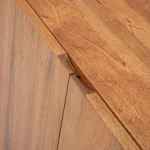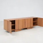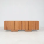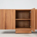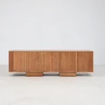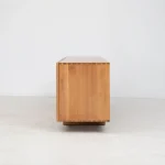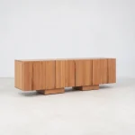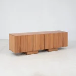The Wolo Media Cabinet by Sun at Six emphasizes the natural characteristics of makata wood with solid front panels that highlight its contrasting grains, color, and luminescent sheen that changes with the light. There is no veneer here, just solid hardwood panels. The back is also fully finished, allowing the piece to float in the middle of a room. The whole piece is combined with joinery, which can be seen externally in the finger joints connecting the sides with the top and base. The media cabinet is part of the Wolo series, which contrasts heavy columns with thin connections and components for a sculptural look.