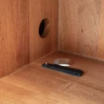 A wire management system allows cables to flow between shelves and to the outside of the sideboard.