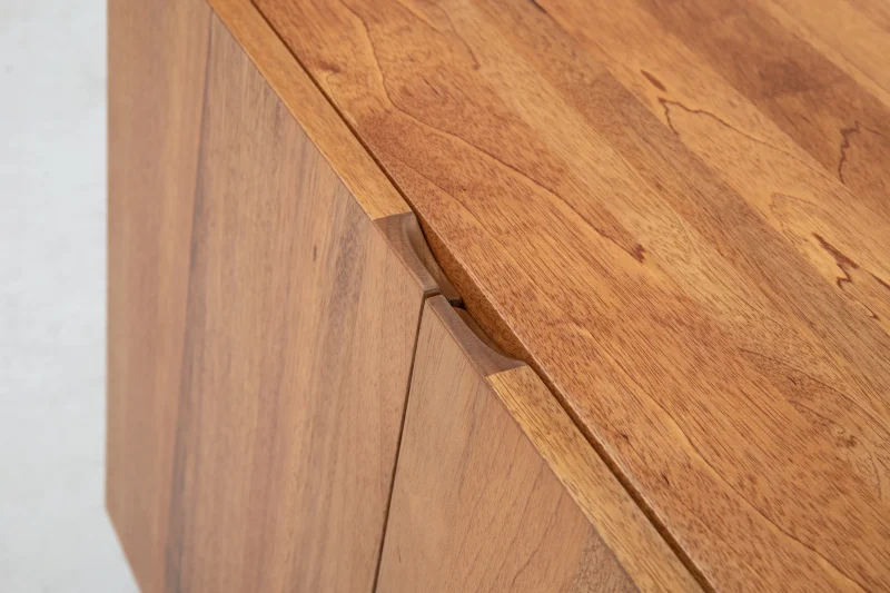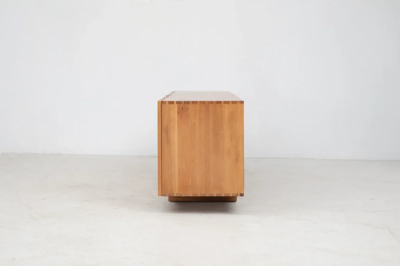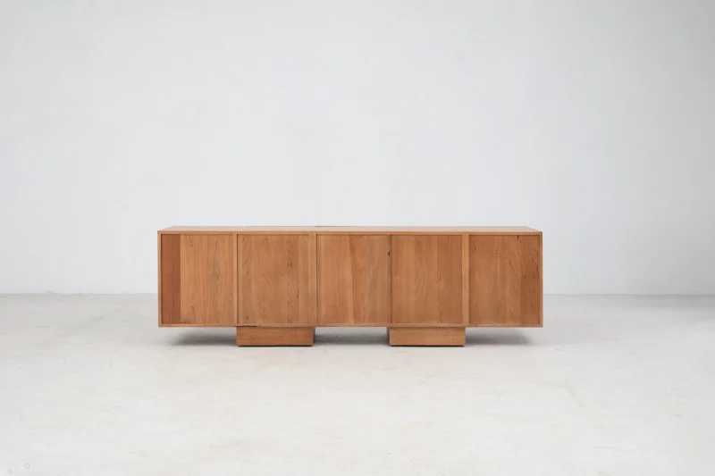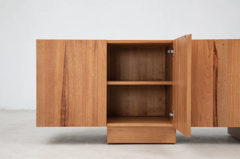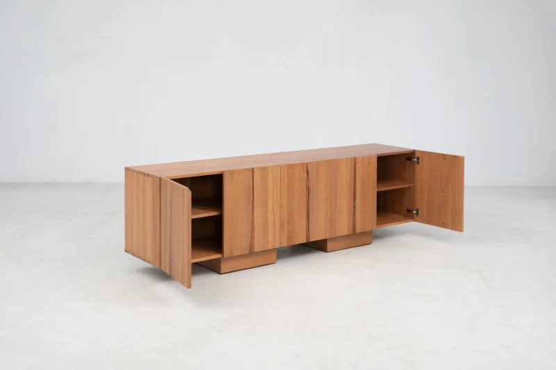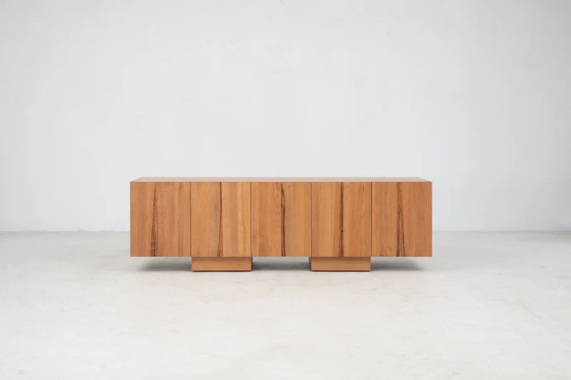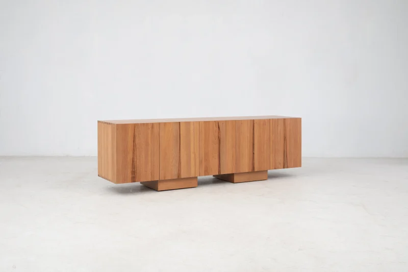 The Wolo Media Cabinet by Sun at Six emphasizes the natural characteristics of makata wood with solid front panels that highlight its contrasting grains, color, and luminescent sheen that changes with the light. There is no veneer here, just solid hardwood panels. The back is also fully finished, allowing the piece to float in the middle of a room. The whole piece is combined with joinery, which can be seen externally in the finger joints connecting the sides with the top and base. The media cabinet is part of the Wolo series, which contrasts heavy columns with thin connections and components for a sculptural look.