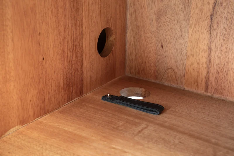 A wire management system allows cables to flow between shelves and to the outside of the sideboard.