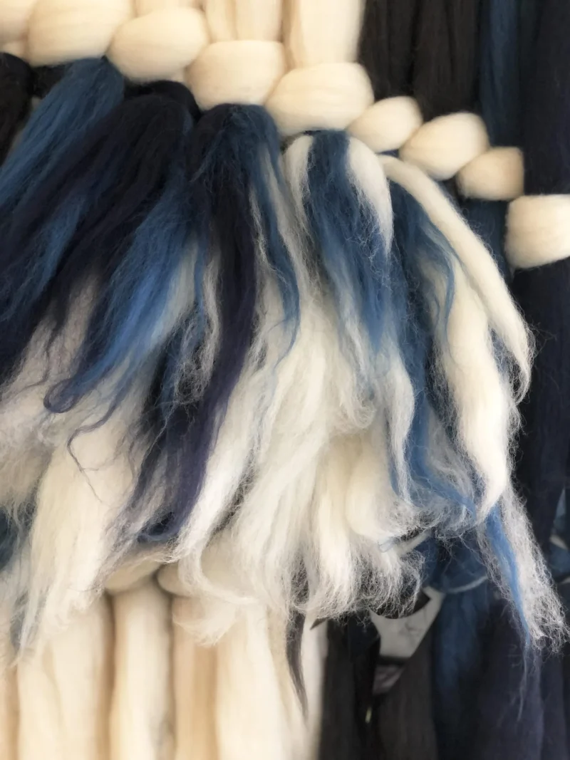 The wool art sits on a recycled brass stick and hangs from a leather string. It carries a unique wooden logo jewellery piece. Created in colour harmonies of blues and off whites.