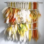 The wool art sits on a recycled brass stick and hangs from a leather string. It carries a unique wooden logo jewellery piece. Created in colour harmonies of neon yellow, orange, off-white and green.