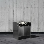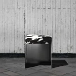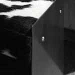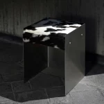 The stool is formed from a single sheet of stainless steel, bent precisely to contain and support a cowhide-upholstered seat. The cushion is firmly anchored to the structural frame using exposed bolts, revealing the construction in a raw and honest way. Nothing is hidden — the fabrication process is part of the design itself. The hide is sourced from a small farm in Cotacachi, Ecuador, bringing a traceable, material narrative to the piece.