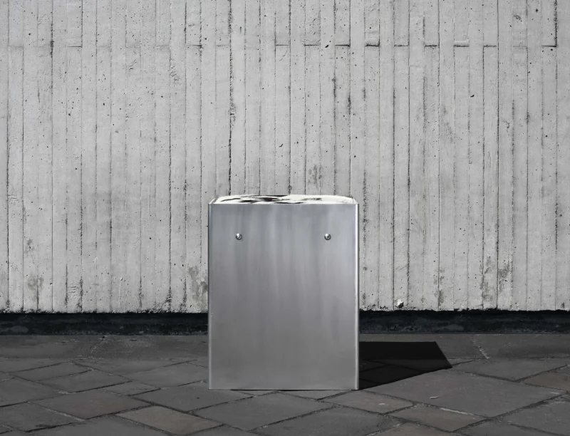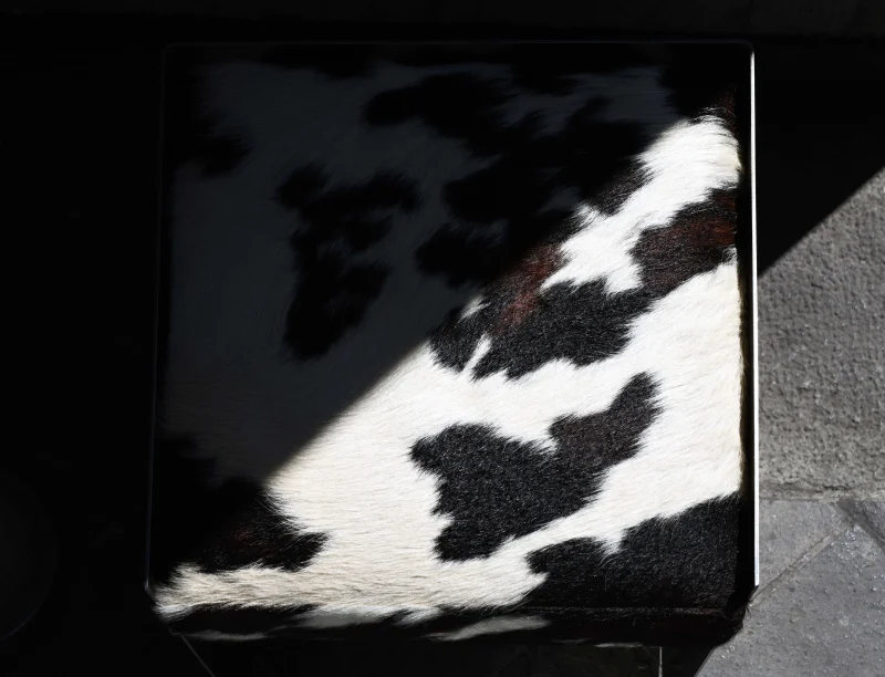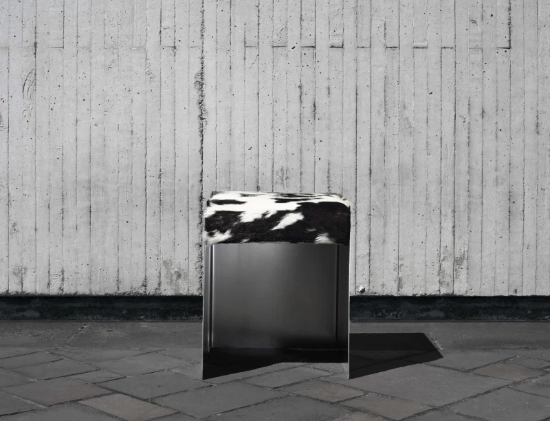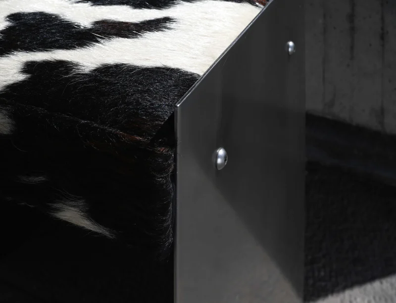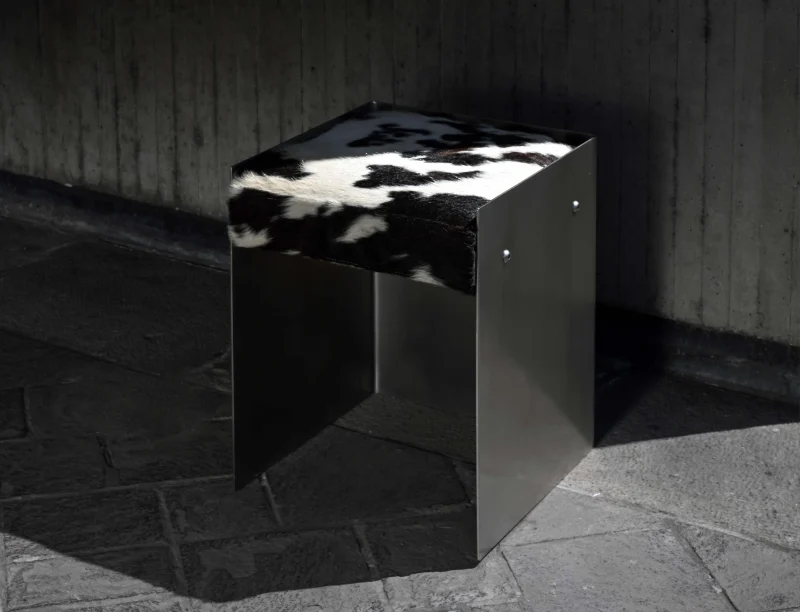 The stool is formed from a single sheet of stainless steel, bent precisely to contain and support a cowhide-upholstered seat. The cushion is firmly anchored to the structural frame using exposed bolts, revealing the construction in a raw and honest way. Nothing is hidden — the fabrication process is part of the design itself. The hide is sourced from a small farm in Cotacachi, Ecuador, bringing a traceable, material narrative to the piece.