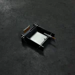 Amid the rigid geometry, a single gesture disrupts the order: the ash tray’s horizontal plate bends gently into a 90-degree curve. This subtle deviation introduces a sculptural moment within the otherwise linear composition, highlighting the tension between structure and softness. The result is an object that balances utility with aesthetic discipline, where every plane, edge, and curve serves both purpose and presence.