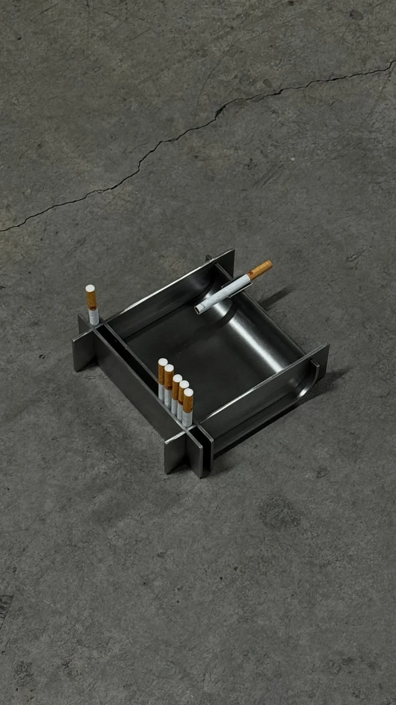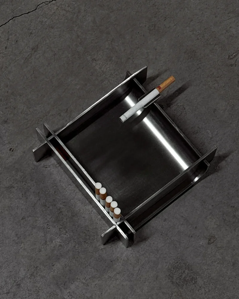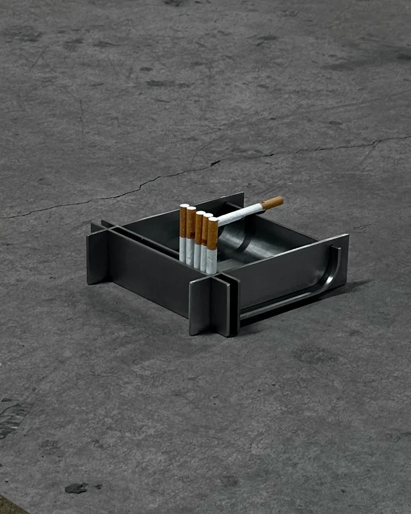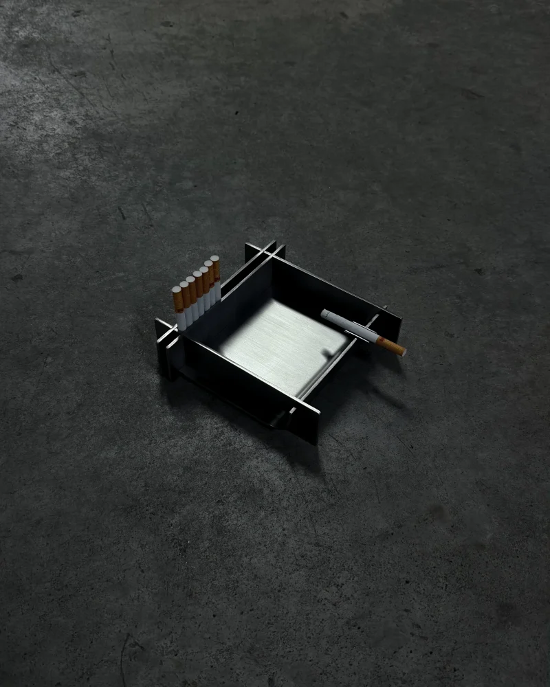 Amid the rigid geometry, a single gesture disrupts the order: the ash tray’s horizontal plate bends gently into a 90-degree curve. This subtle deviation introduces a sculptural moment within the otherwise linear composition, highlighting the tension between structure and softness. The result is an object that balances utility with aesthetic discipline, where every plane, edge, and curve serves both purpose and presence.