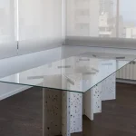 The X Tables series by Donna Maria Feghali features two totem shapes, X and T, as bases for the dining table with metal supports.