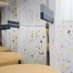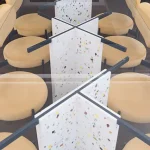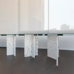 Designed to be graphical, the neo-terrazzo and resin stone colors add a refreshing and fun touch to any space. The visual design shifts from different angles, with the glass top revealing a distinct two-dimensional view up close.