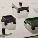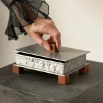 A sculptural storage box by HYZ, designed for playing cards—and beyond. HYZ’s signature card box transforms utility into artistry, merging precise craftsmanship with an expressive, tactile soul. Lined in richly finished wood, its interior is anchored by a central divider—perfectly proportioned to cradle playing cards, keepsakes, or any small essentials worth honoring. The silhouette is clean and architectural, yet softened by the organic irregularity of hand-hammered metal. As light plays across its surface, it reveals a quiet, almost celestial glow—subtle, unexpected, and deeply calming. Offered in a curated range of hues—black, deep violet, grapefruit pink, and forest green—each piece is fully customizable to harmonize with the rhythm and aesthetic of your space. Whether part of a minimalist vignette or a bold interior statement, this box is more than a vessel—it’s a curated experience in color, texture, and intention.