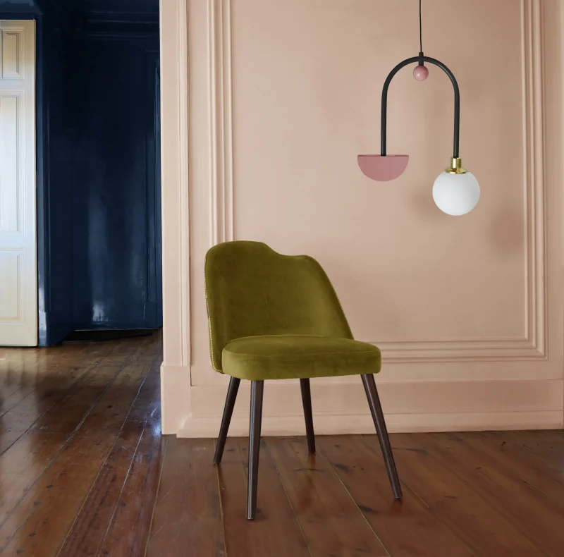 The Yves chair was designed in collaboration between Sergio Prieto and Tiago de Lima. It presents a contemporary structure, with a touch of madness, elegance and radiance. The chair has a traditional yet versatile structure, but his own designer didn’t like the final result so he decided to made a bite and then, it was perfect. The shape and silhouette, paired with the luxe upholstery yield a whimsical Art Deco quality.