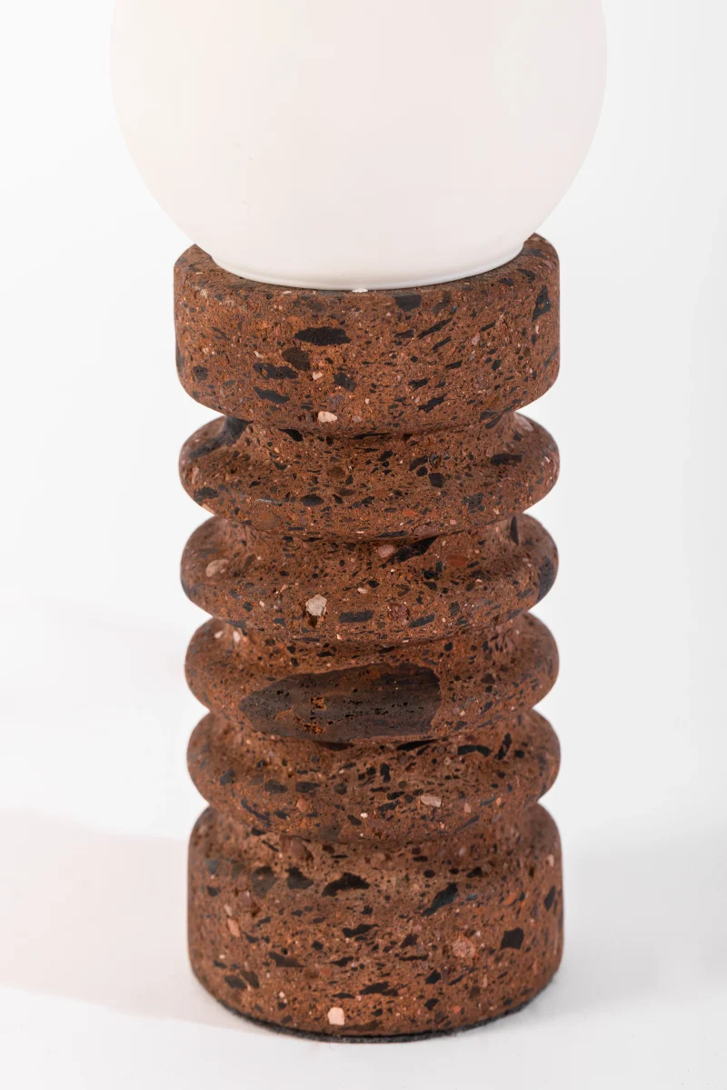 The ZM Sofia Lamp, part of ELLE x Daniel Orozco collection, is a distinctive fusion of elegance and craftsmanship. Crafted from red volcanic stone sourced from Jalisco, this desk lamp exudes warmth and sophistication. Skilled artisans meticulously turn each piece to showcase the natural beauty and unique characteristics of the stone. The lamp features a frosted glass bulb, creating a soft, ambient glow perfect for indoor use.